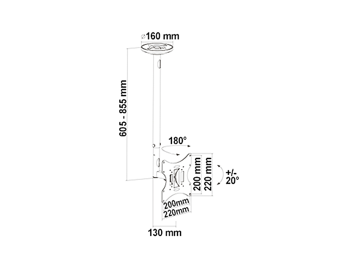 Stabile Deckenhalterung für LCD und TFT Monitor bis zu einer Größe von 42″/30kg. Die VESA-Halterung (75-200) ist schwenkbar (180°) und neigbar (+/- 20°). Eine Kabelführung kann unsichtbar durch das Halterungsrohr erfolgen. Der Lieferumfang beinhaltet Aufbauanleitung und Installationsmaterial.