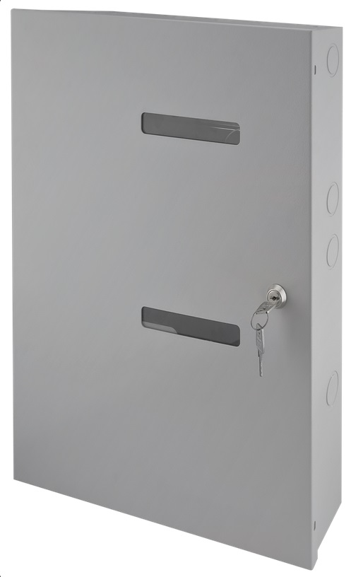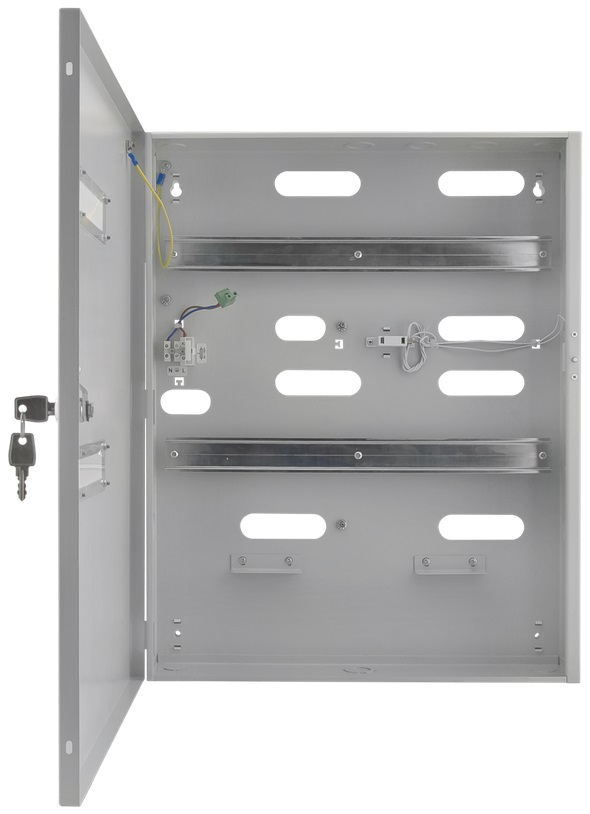 Das große, robuste Stahlblechgehäuse AWO514 ist auf BOSCH-Zutrittskontrollsysteme abgestimmt. Es ist öffnungsüberwacht und verfügt über zwei DIN-Schienen zur Montage der Module. Das Gehäuse vefügt bereits über die passenden Bohrungen um die unterschiedlichen Module möglichst einfach installieren zu können. Zusätzlich zu den Standardkomponenten bietet das Gehäuse Platz für 2 Stück 7Ah/12V-Akkus. Der Kabelsatz zum Anschluss sowie zwei gleichschliessende Schlüssel sind bereits im Lieferumfang enthalten.