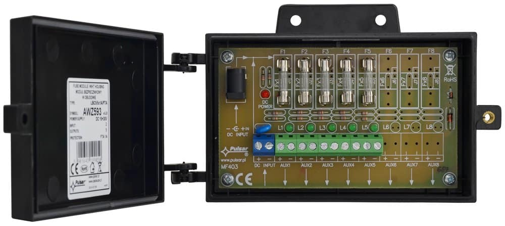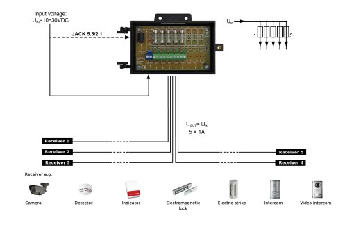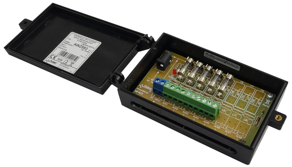 Das AWZ593 ist ein Spannungsverteiler im Kunsstoffgehäuse. Es ist dazu konzipiert die Eingangsspannung (10-30V DC) auf bis zu fünf Geräte zu verteilen.