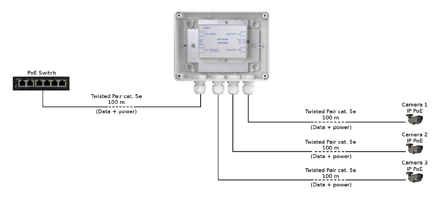 Der PoE-Extender EXT-POE4H verlängert die Reichweite einer Passiv-PoE-Verbindung um zusätzliche 100 Meter. Er kann wahlweise über den PoE-Eingang spannungsversorgt werden, oder mit einer externen 48V-Versorgung als Injektor betrieben werden. Die Auswahl wird über einen Jumper getätigt. Die Gesamtstromabgabe liegt bei 0,4A. Der Extender verfügt sowohl über eine Überlastungs- als auch eine Kurzschlusssicherung.