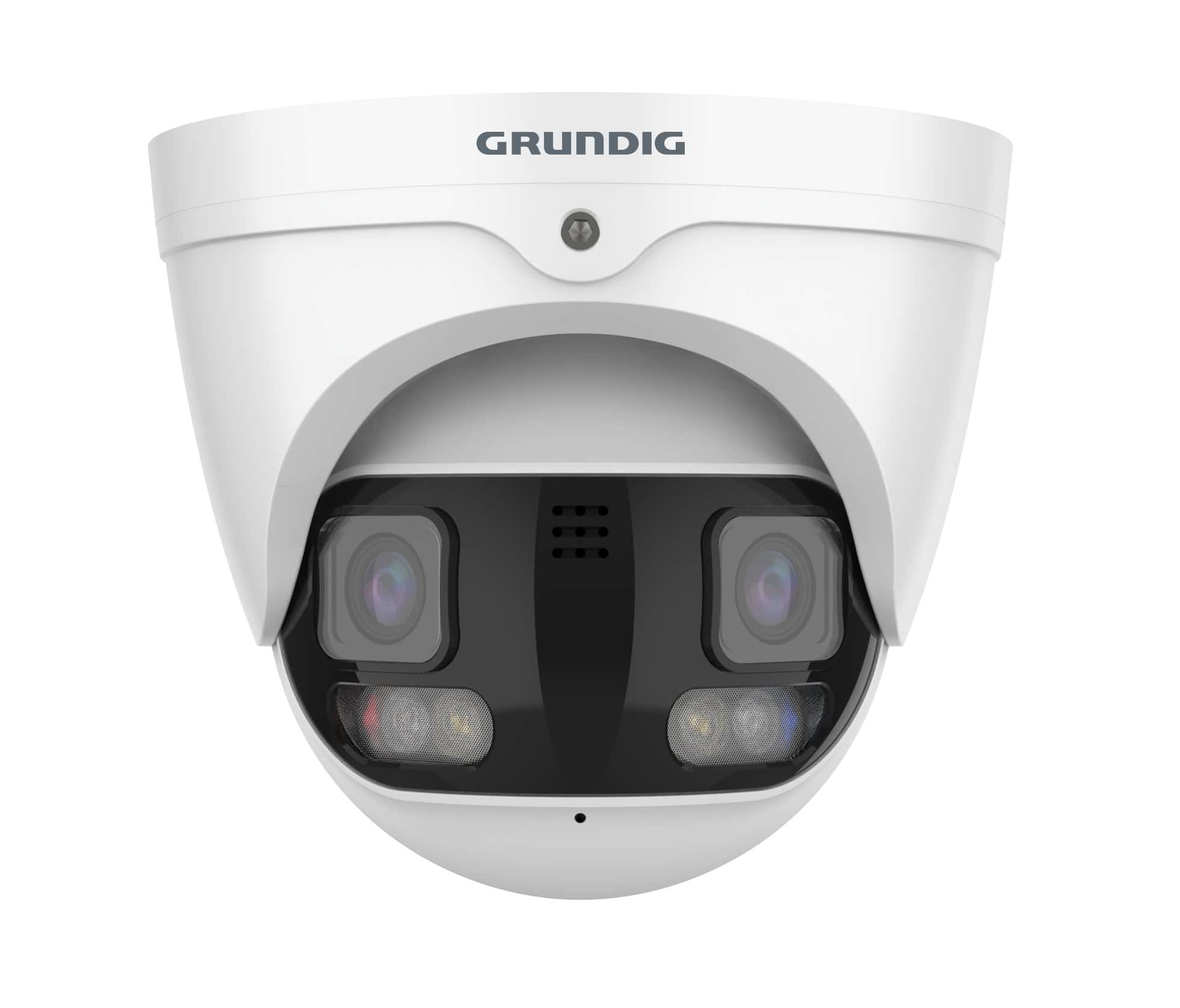 Die GRUNDIG GU-CI-AP8616Q ist eine IP-Kugel-Kamera mit einer 180° Panoramaansicht. Die Alarmfunktionalität mit akustisch/optischerm Alarm (rotes und blaues Licht) kann der Abschreckung von Eindringlingen dienen. Natürlich verfügt die Kamera auch über KI-unterstützte IVS-Funktionen. Die beiden 1/2,7″ CMOS Sensor liefern gesamt eine max. Auflösung von bis zu 5120 x 1440 px bei max. 15 bps. Die Kamera ist ausgestattet mit zwei 2,7mm Objektiven. Die Spannungsversorgung kann wahlweise über 12 VDC oder PoE erfolgen.
