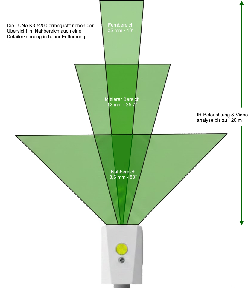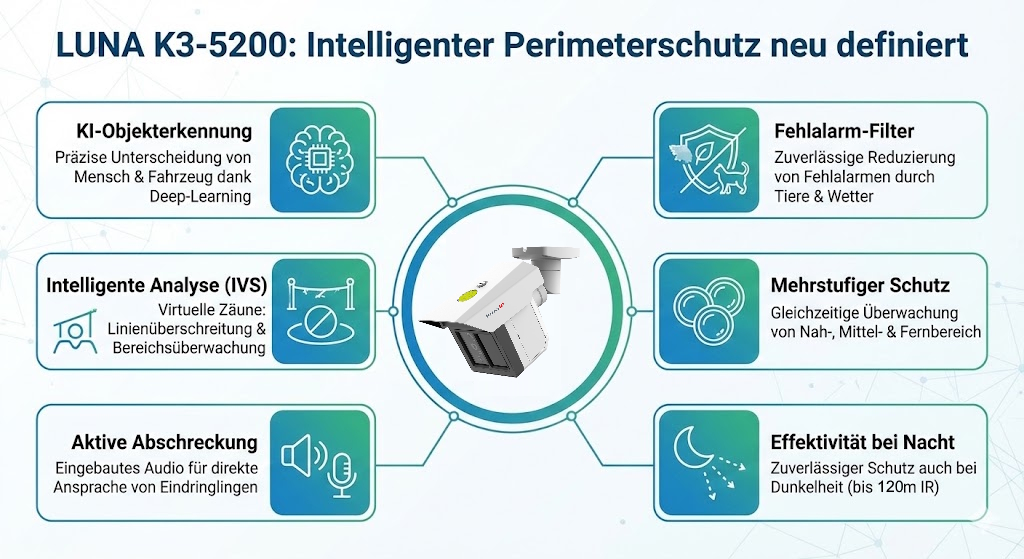 Die LUNA K3-5200 ist eine 3x 2MP Multivision-Bulletkamera, die dank dreier fest verbauter Sensoren eine breite Abdeckung und drei klare Full-HD-Bilder bietet. Mit KI-basiertem Perimeterschutz erkennt sie zuverlässig Personen und Fahrzeuge und erreicht unter Idealbedingungen Erkennungsdistanzen von bis zu 140 Metern. Die integrierte IR-Ausleuchtung sorgt dabei auch nachts für eine Sichtweite von bis zu 120 Metern. Zwei-Wege-Audio, moderne H.265-Kompression sowie ein robustes IP67/IK10-Metallgehäuse machen die Kamera ideal für anspruchsvolle Außenbereiche wie Industrie, Logistik oder weitläufige Gelände. Mit Hilfe einer integrierten Libelle kann die Kamera in der Horizontelen ausgerichtet werden, damit die KI-Analysegenauigkeit möglichst hoch ist. Die Kamera belegt wahlweise einen oder drei Kanäle am LUNA Rekorder.