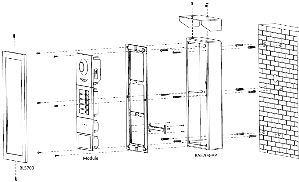 Der Einbaurahmen LUNA RA5703-AP ist für eine Aufputzmontage von drei Modulen der Türsprechanlage LUNA TS5711 vorgesehen. Von der Blende LUNA BL5703 wird für die Installation zusätzlich ein Stück benötigt.