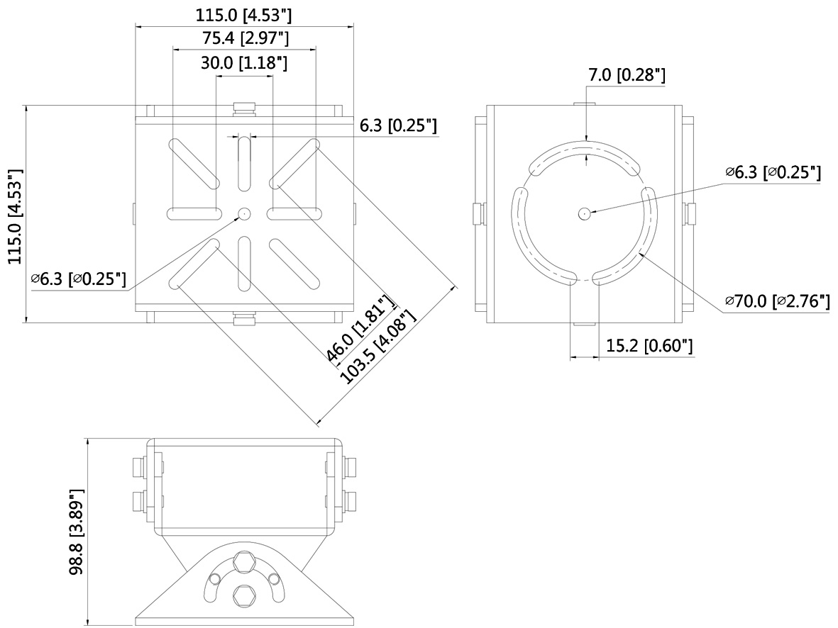 Die Gehäusehalterung dient zur Befestigung der Kamera auf einer ebenen Fläche. Sie läßt sich in 3 Ebenen justieren.