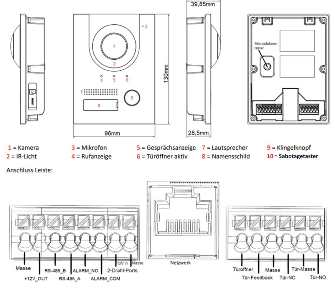 Die LUNA TS5701 v2 ist eine modulare Video-Türsprechanlage. Sie ist für den Außenbereich geeignet und ausgestattet mit Mikrofon, Lautsprecher und Klingeltaster. Die ebenfalls integrierte Kamera weist einen großen Sichtbereich (168,6°) auf und bietet hochaufgelöste Videobilder. Ton, Bild und Stromversorgung für die Türstationsgeräte können wahlweise über ein Netzwerkkabel oder per Zweidraht (PLC-Bus) übertragen werden. Vorhandener Klingeldraht kann verwendet werden, so dass eine aufwändige Neuverkabelung meist vermieden werden kann. Die eingebaute IR-Beleuchtung sorgt auch bei Dunkelheit für ein helles Kamerabild.