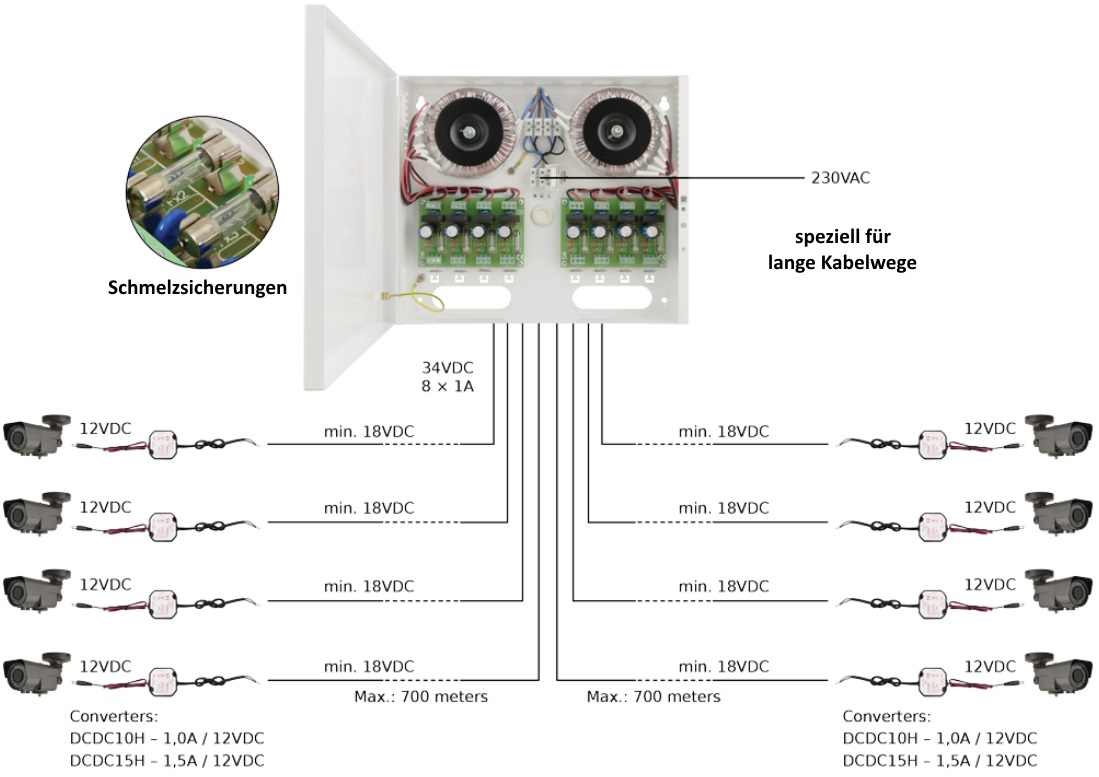 Das PSCU08348SEP ist ein Netzteil für lange Kabelwege im Metallgehäuse für die Stromversorgung von bis zu 8 Kameras. Jede Linie ist einzeln abgesichert und galvanisch voneinander getrennt. Das Netzteil liefert eine stabilisierte Ausgangsspannung von 34VDC mit bis zu 1000 mA (1A-Sicherungen im Lieferumfang) pro Kanal. Durch die hohe Ausgangsspannung werden auch lange Leitungswege kompensiert und man erspart sich eine dezentrale Spannungsversorgung der einzelnen Kameras, sondern kann bequem mit Systemkabel arbeiten. Ausgangsseitig wird lediglich ein DC/DC-Spannungswandler (z.B. DCDC10H) eingeschliffen.