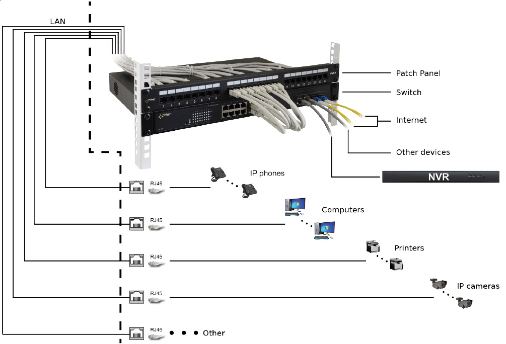 - LSA-Klemmen farbig markiert (568A/B standard)