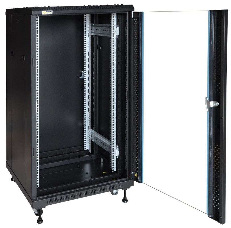 Der fahrbare 19″-Schrank RS2266 bietet 22 Höheneinheiten für CCTV-Verteiler, Patchfelder und 19″-Infrastruktur jeder Art. Er lässt sich bequem über die Schwerlastrollen zum Montageort transportieren und kann über die beiliegenden Stellfüße fixiert werden. Die hochwertige Verarbeitung und ein durchdachtes Installationsmanagement für Montagestege, Kabelhalter und Rack-Technik erleichtern die Fertigung, Erweiterung und Wartung der Systeme. Die Fronttür besteht aus 5mm gehärtetem Glas. Durch den justierbaren Abstand der vorderen und hinteren Schienen ist der Schrank an die unterschiedlichste Technik anpassbar. Die geringe Tiefe ermöglicht die Installation bei beengten Räumlichkeiten. Montagemöglichkeiten für Belüftungssysteme (RAWP und andere) sowie spezielle Belüftungsbleche an Vorder-, Unter- und Oberseite schützen vor Stauhitze und erleichtern das Temperaturmanagement.