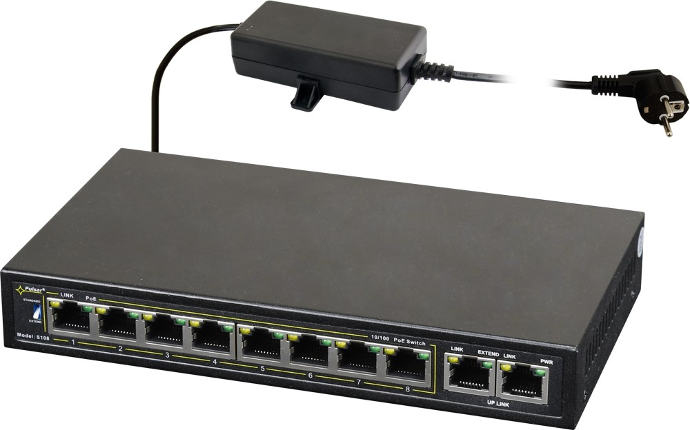 Der S108 ist ein 10-fach PoE+ Industrieswitch. Es können bis zu 8 Kameras an den Switch angeschlossen und über die PoE-Ports mit Spannung versorgt werden. Der Switch verfügt über eine automatische Erkennung des PoE/PoE+ Standards. Das Gesamtbudget für PoE beträgt 96W (max. 30W je Port). Der Switch hat zudem zwei Uplink-Ports mit ebenfalls 100 MBit. Alle Ports verfügen über Auto MDI/MDIX und Auto Crossover.