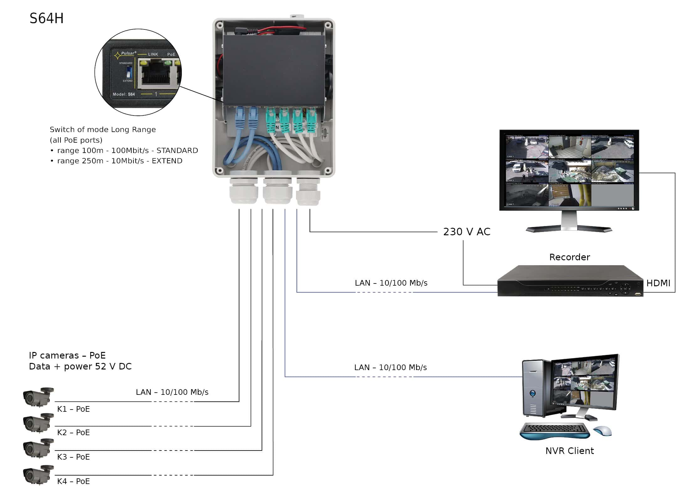 Der S64H ist ein 6-fach PoE+ Industrieswitch in einem luftdichten Gehäuse. Es können bis zu 4 Kameras an den Switch angeschlossen und über die PoE-Ports mit Spannung versorgt werden. Der Switch verfügt über eine automatische Erkennung des PoE/PoE+ Standards. Das Gesamtbudget für PoE beträgt 30 W (max. 30 W je Port). Der Switch hat zudem zwei Uplink-Ports mit ebenfalls 100 MBit. Alle Ports verfügen über Auto MDI/MDIX und Auto Crossover.