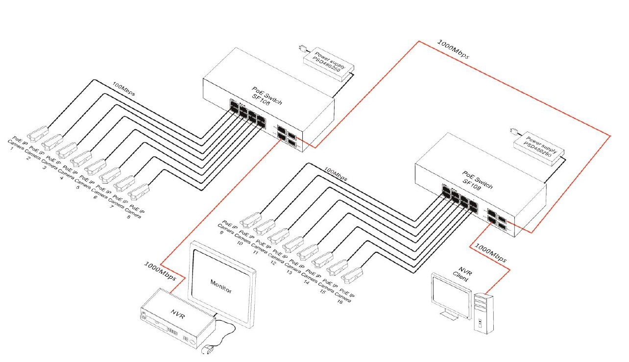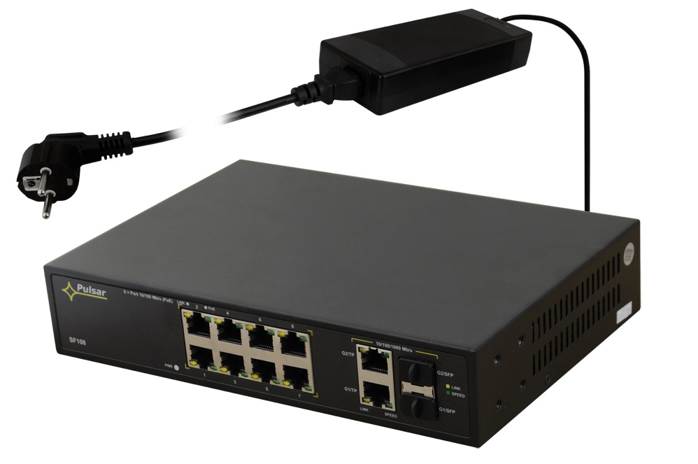 Der SF108 ist ein 10-fach PoE+ High-Speed-Switch. Es können bis zu 8 Kameras an den Switch angeschlossen und über die PoE-Ports mit Spannung versorgt werden. Der Switch verfügt über eine automatische Erkennung des PoE/PoE+ Standards. Das Gesamtbudget für PoE beträgt 96W. Der Switch hat zudem zwei Uplink-Ports mit GigaBit. Alle Ports verfügen über Auto MDI/MDIX und Auto Crossover.