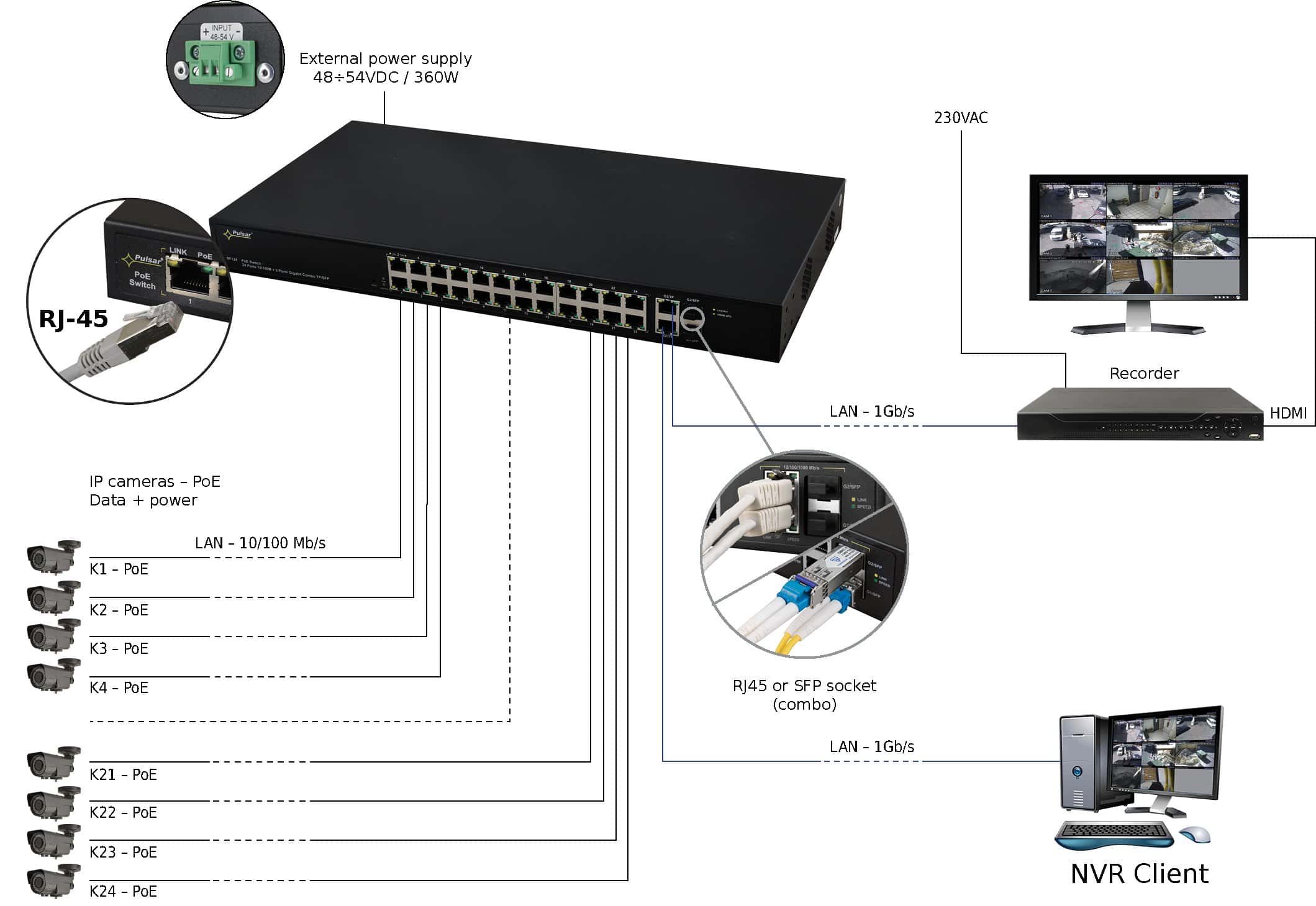 - Anschluss von bis zu 24 IP-Kameras