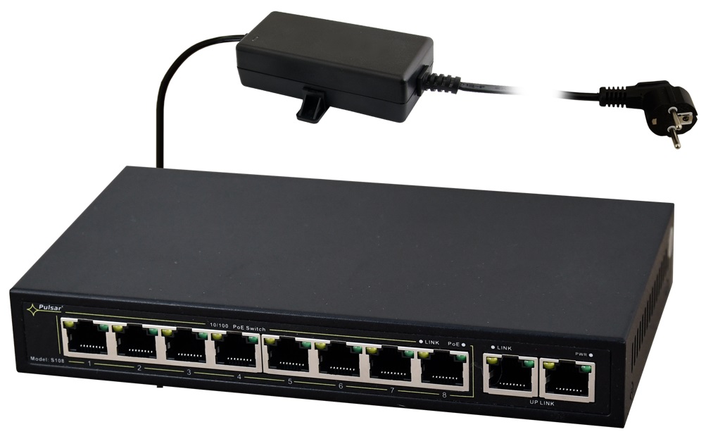 Der SG108 ist ein 10-fach PoE+ Highspeed-Switch. Es können bis zu 8 Kameras an den Switch angeschlossen und über die PoE-Ports mit Spannung versorgt werden. Der Switch verfügt über eine automatische Erkennung des PoE/PoE+ Standards. Das Gesamtbudget für PoE beträgt 96W (max. 30W je Port). Der Switch hat zudem zwei Uplink-Ports mit ebenfalls GigaBit-Anbindung. Alle Ports verfügen über Auto MDI/MDIX und Auto Crossover.