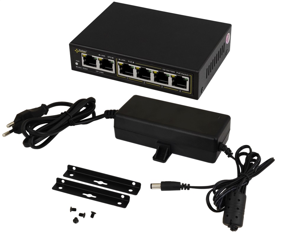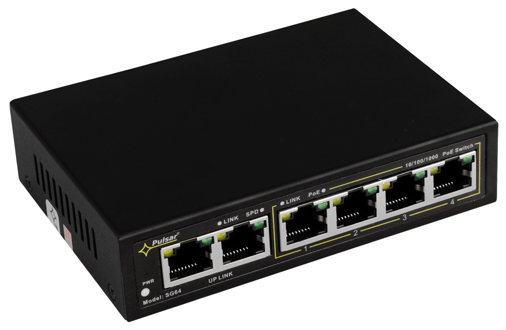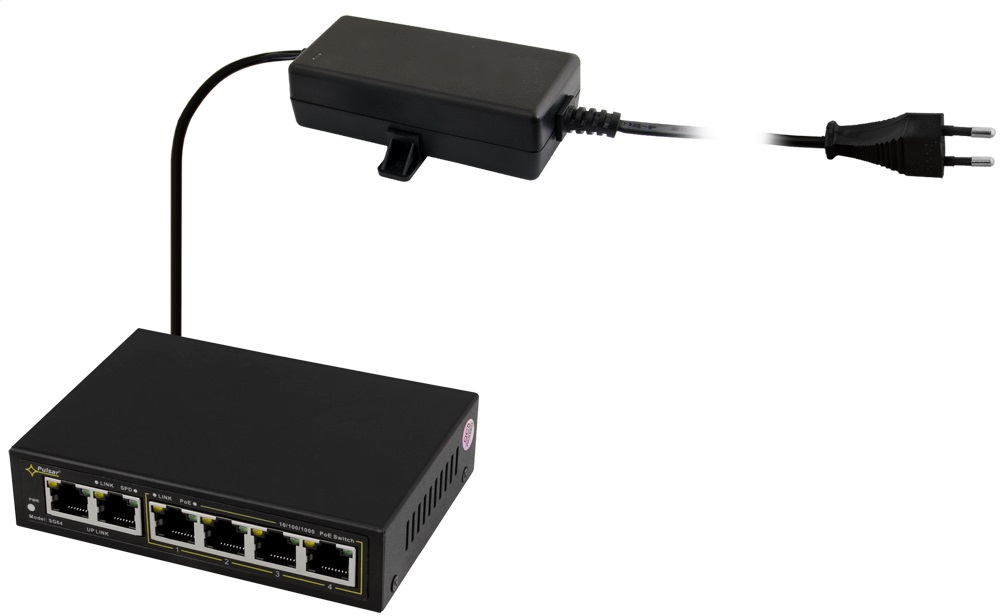Der SG64 ist ein 6-fach PoE+ Gigabit-Switch. Es können bis zu 4 Kameras an den Switch angeschlossen und über die PoE-Ports mit Spannung versorgt werden. Der Switch verfügt über eine automatische Erkennung des PoE/PoE+ Standards. Das Gesamtbudget für PoE beträgt 48W (max. 30W je Port). Der Switch hat zudem zwei Uplink-Ports mit ebenfalls GigaBit-Anbindung. Alle Ports verfügen über Auto MDI/MDIX und Auto Crossover.