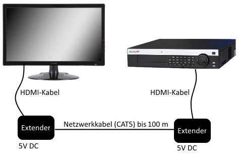 Der VGA-Extender ermöglicht den Anschluss eines abgesetzen VGA-Monitors an einen Rekorder oder Videoserver. Dabei kann eine Entfernung von bis zu 100 m überbrückt werden. Die Übertragung erfolgt über ein handelsübliches Netzwerkkabel (CAT5).